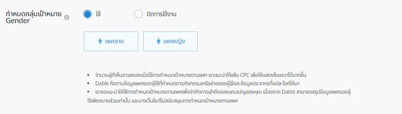 คุณสามารถลงโฆษณาไปยังผู้ใช้งานซึ่งมีแนวโน้มจะเป็นเพศที่คุณกำหนดเป้าหมายได้ด้วยการกำหนดเป้าหมายตามเพศได้ Dable สมมติเพศของผู้ใช้งานตามกิจกรรมของผู้ใช้งานบนเครือข่ายและข้อมูลประชากรซึ่งได้รับจากเว็บไซต์ต่าง ๆ