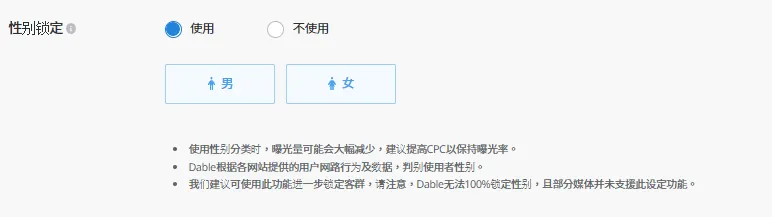 由于 Dable 只能假设某些用户的性别(并非全部),同时并非所有网站都支援性别锁定,因此使用此功能可能会限制您的广告活动的触及范围。
