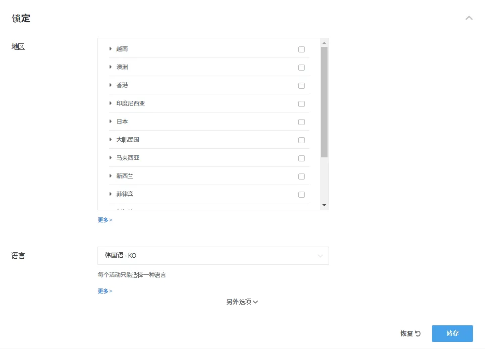 地区与语言锁定让您可以根据用户的 IP 来锁定该地区的用户,您可以锁定单一市场,或其中的部分地区。