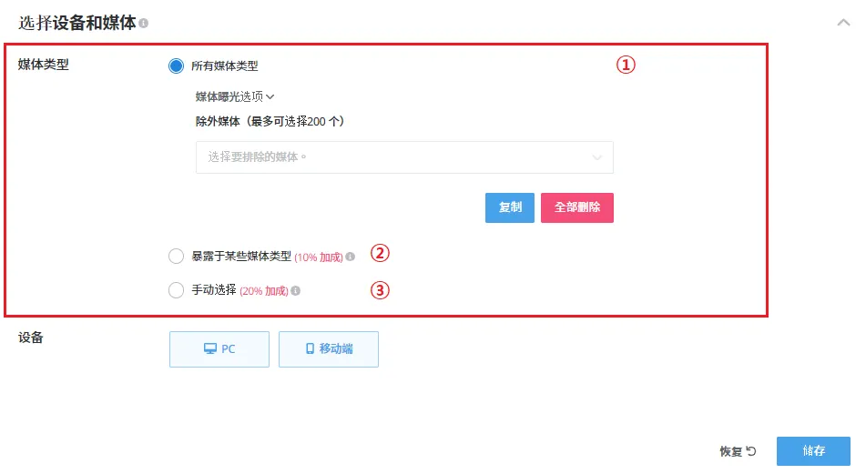 到‘活动管理’ – 选择您要更改的广告活动 – ‘选择装置与媒体’ – 依需求进行更改